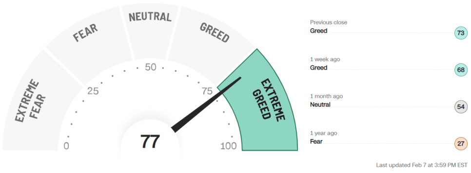 공포, 탐욕 지수는 77(을/를) 가리키고 있습니다.