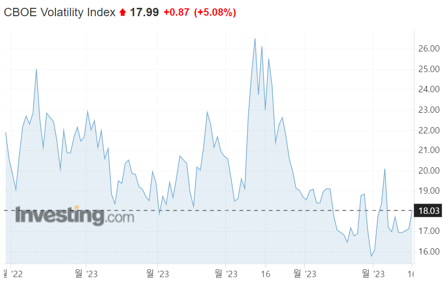 S&P 500 옵션에 기반한 변동성 지수인데 정상적일 때 평균치가 19.5 정도 되는데